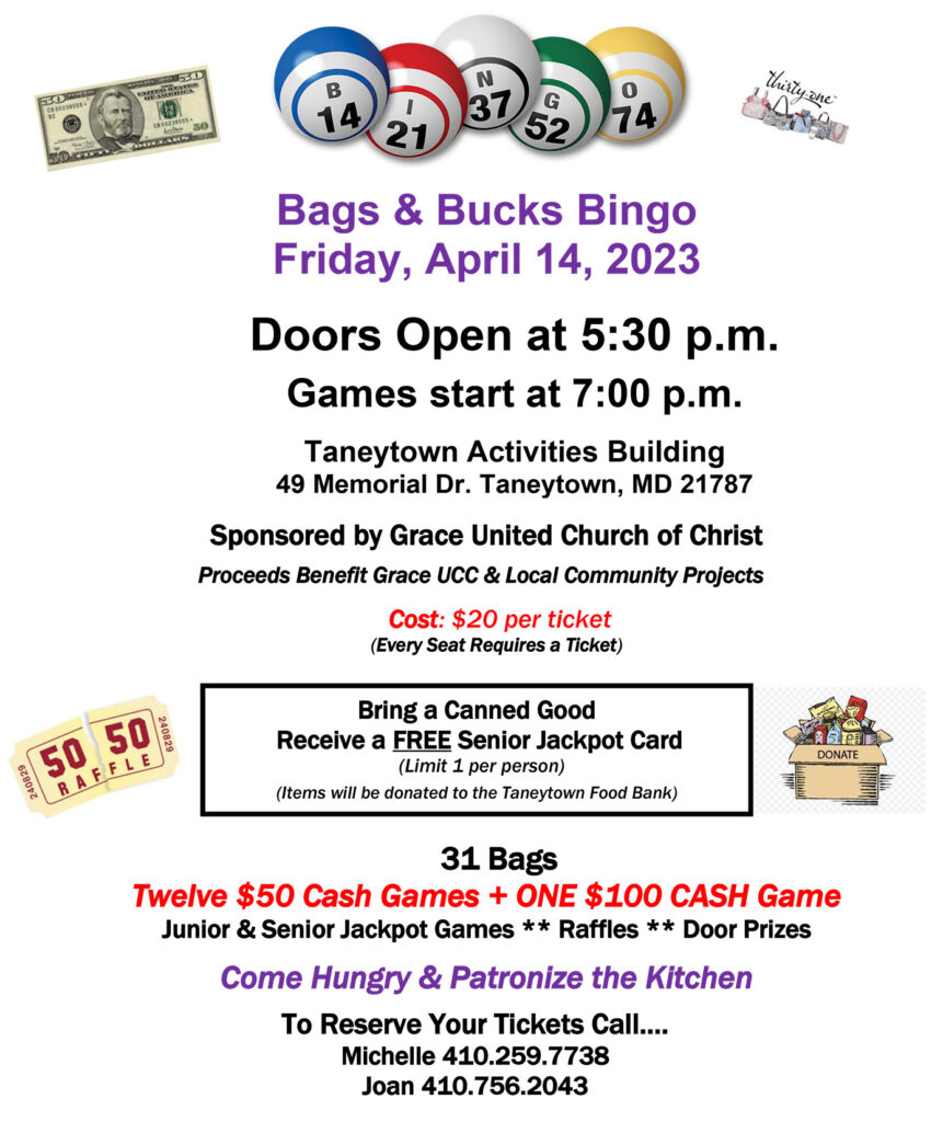 admin Bags and Bucks Bingo Date: April 14, 2023Time: 5:30 am - 10:00 amLocation: Taneytown Activities Building, Taneytown MarylandBingo